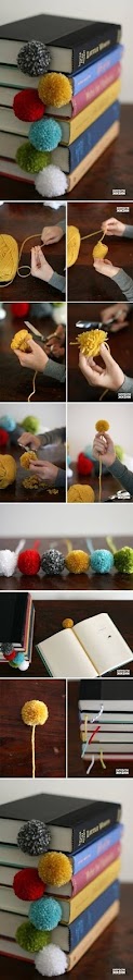 10.? Y por último esta idea divertida y super cool para hacer marca libros, son pompones de lana, solo debes dejar un trozo largo de lana (con el que amarras el pompón) .