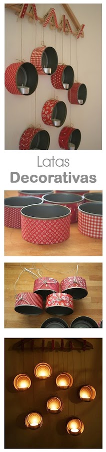 1.? Esta idea es muy linda, realizada con latas y decoradas con tela y cinta o mecatillo, tienen unas velitas pero puedes colocar algún otro adornito si quieres.