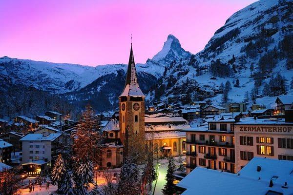 Zermatt es una pequeña ciudad famosa por el esquí y el montañismo debido a su proximidad al Matterhorn, una de las montañas más altas de Suiza. Teleféricos llevan a los esquiadores de las montañas circundantes en el invierno y a los excursionistas en el verano. Zermatt es una buena ciudad para caminar a varios sitios, ya que los vehículos a gasolina no están permitidos. Cualquier vehículo dentro de los límites de la ciudad debe ser operado por batería. Afortunadamente para los visitantes, se tarda 30 minutos o menos caminar entre los sitios. La ciudad es accesible vía las rutas escénicas del tren que la conectan con el mundo exterior. No hay duda de que es un hermoso sitio que ver en Suiza.