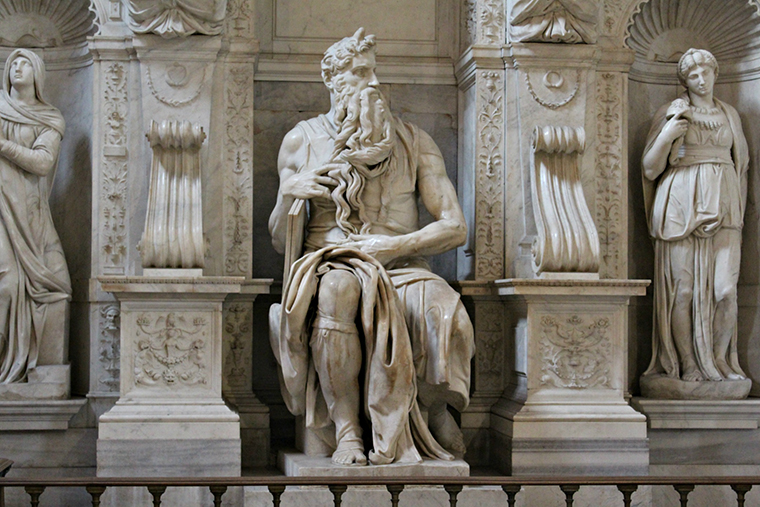 El exterior de esta iglesia pasa totalmente desapercibido y no es lo que llama la atención, sin embargo hay dos elementos claves que convierten a San Pietro in Vincoli en una iglesia tan atractiva y visitada. Esta iglesia fue construida en el siglo V para albergar las cadenas de San Pedro con las que fue encadenado en Jerusalén. En ella también se encuentra una de las esculturas más conocidas de Miguel Ángel, El Moisés. En general es un templo sencillo y poco decorado pero merece la pena su visita además de poder contemplar la escultura, sus representaciones de esqueletos son poco comunes en otras iglesias.