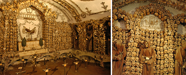 (Basilica di Santa Maria della Concezione dei Cappuccini) Esta basílica no es tan conocida como el resto y sin embargo es una de las más especiales de Roma. Es una basílica muy reducida y modesta, todo lo contrario a la ostentación del resto de iglesias de la ciudad. Fue mandada construir en el año 1623 bajo las ordenes del Papa Urbano VIII y lo que la hace realmente tan especial es el macabro tesoro que guarda su cripta; un lugar no apto para gente demasiado sensible, pues es espeluznante. Los restos mortales de todos los hermanos Capuchinos se trasladaron del cementerio a esta cripta y se ordenaron de forma "decorativa y artística", sin embargo el resultado es escalofriante.