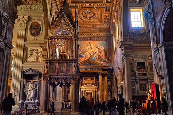 (Basilica di Santa Maria Maggiore) Es una iglesia enorme, también considerada una de las 4 más importantes de la ciudad. Fue construida a mediados del siglo IV sobre un antiguo templo romano bajo la orden del Papa Liberio I. Cuenta la leyenda que la virgen se apareció ante el Papa para indicarle cómo debía ser esa basílica, diseñada por una nevada milagrosa. De ahí a que también se conozca a esta iglesia como Santa Maria della Neve, pero su nombre definitivo se debe a que es la mayor de las iglesias dedicada a la Virgen. En su interior se diferencian numerosos estilos artísticos como si de retales se tratara, desde el Barroco más reciente, el Renacimiento, mosaicos y el campanario de la época Medieval y algunas columnas jónicas de las antiguas construcciones romanas. Ideal para observar las épocas más importantes del arte Cristiano.