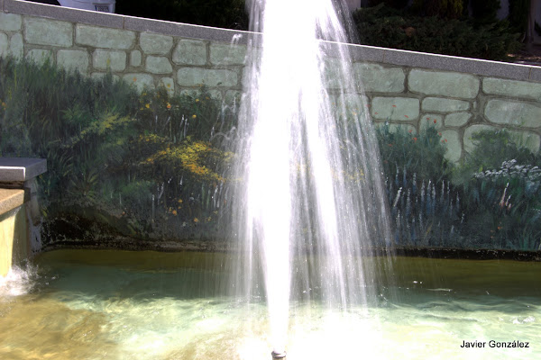 Piedras y flores pintadas nos hace creer que forman las paredes de la fuente a estilo francés.