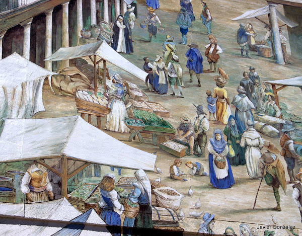 Mercado del siglo XVI de gran realismo con sus puestos, compradores y mercaderes.