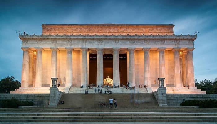 El monumento conmemorativo más querido de Washington está separado del Monumento a Washington por la Piscina Reflectante. En su centro hay una estatua de mármol de 19 pies de Abraham Lincoln sentado y pensativo. Está rodeado de 36 columnas, una para cada uno de los estados que existían en el momento de la muerte de Lincoln.