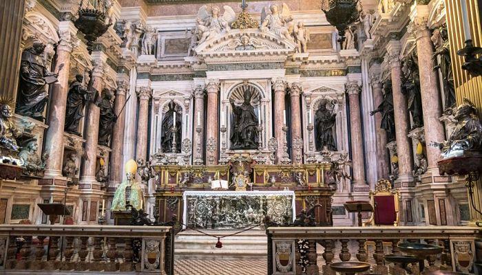 Puedes ver la tumba del santo en la ricamente decorada Confessio (1497-1506) debajo del altar mayor. Y en la zona arqueológica subterránea, se puede ver la Basílica Santa Restituta del siglo IV, la iglesia más antigua de Nápoles. Allí verás excelentes frescos de techo y columnas de un templo romano.