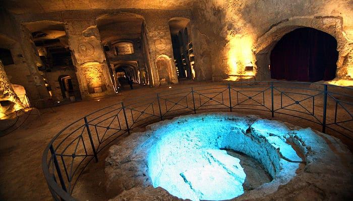 Las catacumbas de San Gennaro del siglo II son un laberinto de pasajes y cámaras de tumbas. Pero estas son más ambiciosas arquitectónicamente y tienen pinturas más finas que sus contrapartes romanas. Hay dos niveles y en la bóveda superior de la catacumba hay frescos del siglo II. Aquí también está la pequeña cripta de los obispos y la gran basílica subterránea, con tres naves cortadas en la piedra.