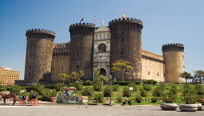 El Castel Nuovo de cinco torres es también conocido como el Maschio Angioino. Era la residencia de reyes y virreyes de Nápoles. Su historia refleja los varios gobernantes pues cada uno agregó o restauró para adaptarse a los tiempos. Originalmente fue construido por Carlos I de Anjou en 1279-82, y fue ampliado por Alfonso I de Aragón. Fue este último quien agregó el gran Arco Triunfal del Renacimiento temprano entre las torres para celebrar su entrada victoriosa en la ciudad.