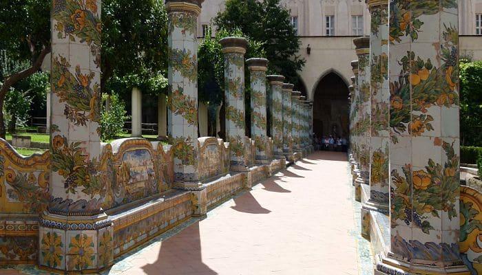 El claustro del Monasterio de Santa Chiara de 1310, parece más a un parque en un balneario que un solemne retiro para monjas. Tiene azulejos hechos en los talleres de Capodimonte en colores y diseños vivos. Estos cubren las 66 columnas octogonales que rodean el claustro y entre las columnas hay largos bancos también cubiertos de azulejos. Estos parecen traer el mundo secular dentro de las paredes del monasterio.
