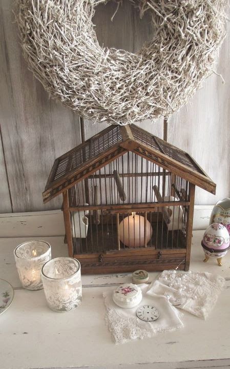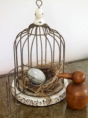 Esta jaula simulando una de verdad decorada con un poquito de paja y un huevo de marmol o cerámica, muy vintage.