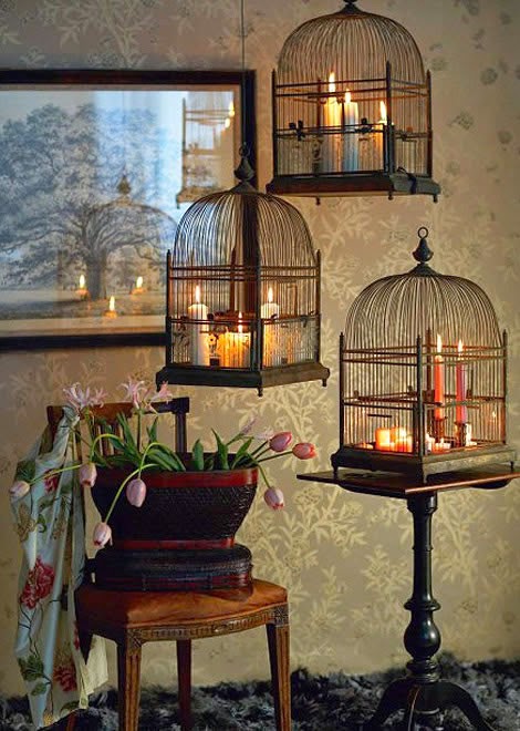 Las jaulas decorativas como elementos de iluminación ya sea con velas o bombillas, crean un ambiente muy intimista y acogedor. ¿No os parece?
