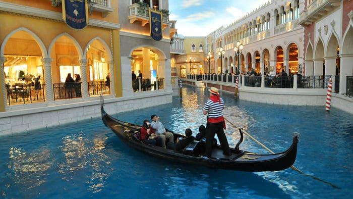 Pero los paseos en góndola son la manera más divertida de ver el hotel. Frente al hotel los barcos esperan a los pasajeros que son llevados en un paseo a través de la galería comercial dentro del hotel.