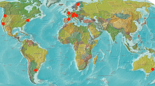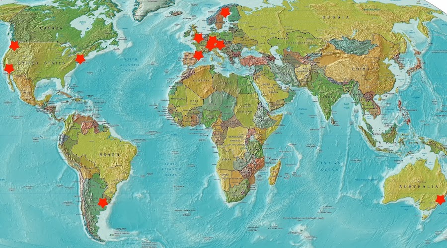 Y aquí entró en acción mi mente científica (o mi deformación profesional, como queráis verlo) y trazó un plan de acción. A ver, para que los resultados sean representativos necesitaré: personas que acaben de llegar a su nuevo país, personas que lleven un tiempo viviendo en él, personas que se hayan ido solas, otras que vayan con alguien, algunas jóvenes, otras de más edad, hombres y mujeres, que tengan diferentes profesiones, que se hayan mudado por diferentes motivos y que estén en varios lugares del mundo. Bueno, y que entiendan español, les apetezca compartir con nosotros su experiencia y tengan tiempo para hacerlo ¿Fácil no? Pues sorprendentemente: sí. Gracias a internet y a que tengo unos amigos y familiares muy aventureros (y la mar de apañados), en un par de semanas he conseguido detalles bastante jugosos. Han participado doce personas, entre 22 y 77 años, con profesiones que van desde ingeniero hasta monja, entre ellos hay recién llegados, personas que llevan meses fuera de casa y personas que llevan años. Respecto a los países, como supongo que ya habréis adivinado, las estrellas rojas representan las localizaciones donde se encuentra cada uno de ellos, en diferentes ciudades de nada menos que nueve países distintos.