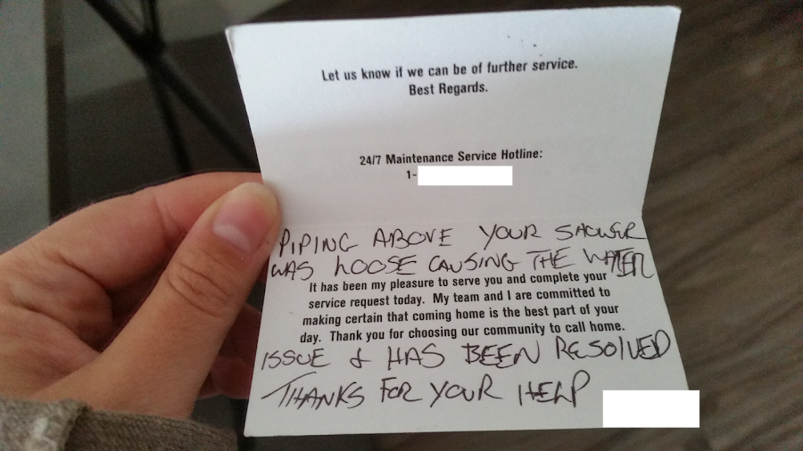 Para no hacerme pesada os diré que tras más de una semana de idas y venidas me lo acabaron arreglando. Sam se presentó y me contó la misma teoría de las bañeras… y hasta que no se la desmonté con datos (registro de fugas con tiempos y demás) no accedieron a abrir la dichosa portezuela y hurgar a ver qué pasaba. Uno de los días al llegar a casa encontré esta nota, de su puño y letra.