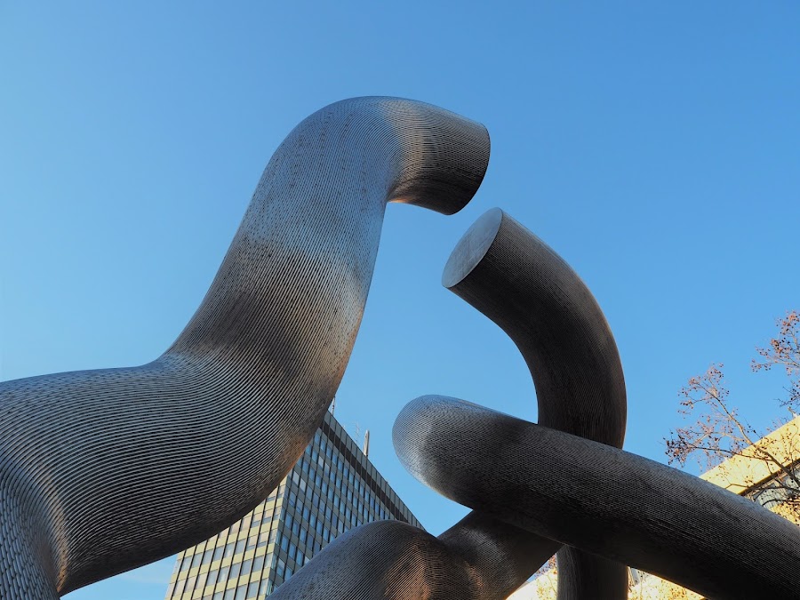 Se trata de mi escultura berlinesa favorita y probablemente, de la que más veces disfruté. Más concretamente, está situada a la altura del centro comencial Europa-Center en la mediana de la calle Tauentzienstraße. Fue creada por una pareja de artistas alemanes e inaugurada en 1987. Podría definirse como una escultura abstracta de grandes dimensiones que se compone de cuatro tubos de acero que se rodean entre sí. Simbolizan las conexiones que en su momento había (o no había) entre el Berlín del Este y del Oeste cuando aún estaba en pie el Muro de Berlín. Con ella, los artistas querían transmitir las sensaciones de cercanía y de aislamiento a la vez. Y de ahí, viene su nombre: encuentros. Algo que me parece muy curioso, es que cambia de color dependiendo del momento del día. Pero también, su localización: elegida por los artistas y que permite jugar con las perpectivas. A continuación, te enseño cuál es mi favorita.