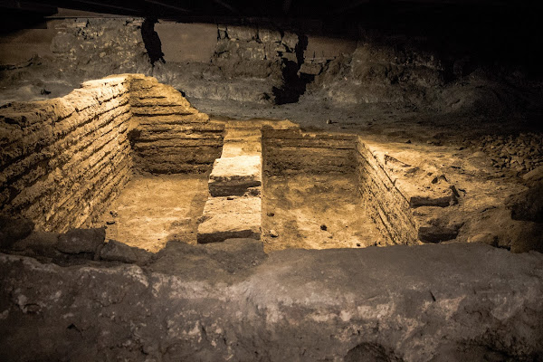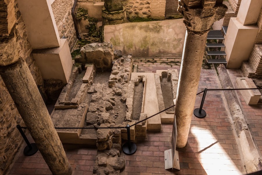 Pero lo más curioso de todo, y ahora es donde viene el secreto, es que la actual iglesia está construida sobre una antigua mezquita hispano-musulmana cuya fecha está por determinar, aunque algunos investigadores la datan en 1041 o posiblemente anterior. Accediendo al pasillo de piedra situado a la izquierda y bajando a través de unas excavaciones misteriosamente iluminadas en amarillo, llegas al final de las escaleras a los restos de la mezquita que te dejan sin habla. La sensación es que has encontrado un tesoro escondido de miles de años como en una película de aventuras. Precioso .