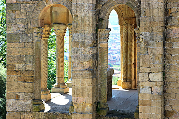 Santa María del Naranco. Los miradores se estructuran en triple arquería que apoyan sobre columnas con fustes labrados y capiteles corintios.