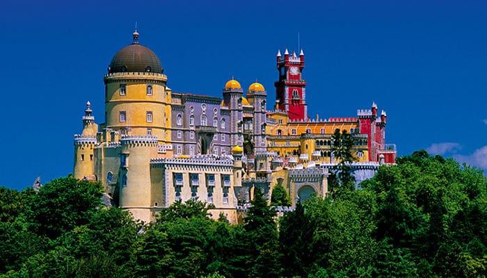 De lejos, el Palacio da Pena se asemeja a un enorme pastel de cumpleaños. Con sus fachadas de color rosa y limón, torres almenadas, cúpulas y torrecillas giratorias. Fue construido en el siglo XIX para satisfacer el capricho de Fernando, esposo de la reina María II. Corona el pico más alto de la Serra de Sintra y su estrafalario perfil se puede ver desde tan lejos como Lisboa.