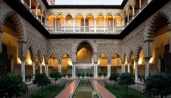 El Real Alcázar fue originalmente la fortaleza medieval de los gobernantes moriscos y más tarde de los reyes cristianos. El palacio fue construido en el siglo X. Después de la Reconquista Cristiana en la década de 1360, los arquitectos moriscos crearon los edificios de estilo mudéjar para el Rey Pedro el Cruel. Los visitantes entran en el palacio a través de la Puerta Principal que conduce al Patio de las Doncellas. Este patio ejemplifica la arquitectura islámica con magníficos arcos con obras de arabesco abierto sobre 52 columnas de mármol. La más antigua de las salas es la Sala de los Embajadores. Cuenta con un espléndido techo con frisos decorativos e inscripciones en árabe. La Sala de Audiencias es una de las salas más ornamentadas del palacio, con un espléndido techo intrincadamente tallado en madera.