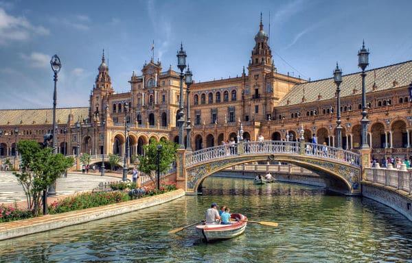 Dentro del Parque de María Luisa se encuentra la Plaza de España. Este es uno de los monumentos más impresionantes de Sevilla debido a su escala y grandeza. La enorme plaza de 50.000 metros cuadrados está rodeada por los balcones de un edificio de estilo neo-morisco renacentista. Este edificio semicircular se curva alrededor, siguiendo la forma del canal que atraviesa la plaza. Una fuente monumental es la pieza central de la plaza. Mientras que el tranquilo canal está atravesado por cuatro pasarelas. Los turistas pueden alquilar un bote de remos para experimentar la “Venecia de Sevilla”.