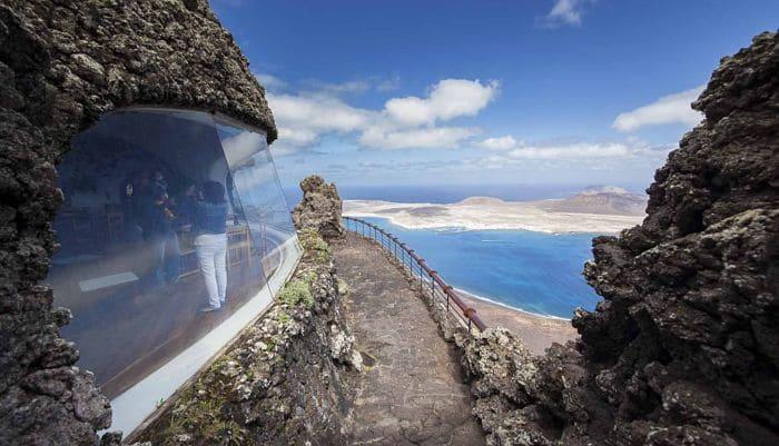 ¿Qué haces con una fortaleza que una vez tuvo una batería de cañones? Bueno, si eres Cesar Manrique, aprovechas al máximo su posición en el acantilado y lo conviertes en un bar y cafetería. Pero no es sólo la peculiar arquitectura que tiene lo que atrae a los visitantes al Mirador del Río. Lo que sucede es que puede tener vistas de primera clase de la playa de El Risco y las llanuras de sal, también. Está situado en el extremo noroeste de Lanzarote. El Mirador es un centro de visitantes construido encima de altos acantilados. La plataforma de observación se eleva a 479m sobre el nivel del mar.