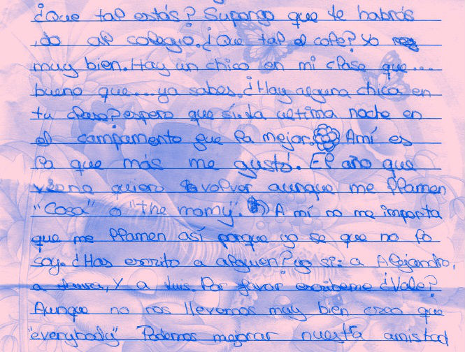 ¿Qué tal estás? Supongo que te habrás ido al colegio. ¿Qué tal el cole? Yo muy bien. Hay un chico en mi clase que... bueno que... ya sabes. ¿Hay alguna chica en tu clase? Espero que sí. La última noche en el campamento fue la mejor. A mí es la que más me gusta. El año que viene quiero volver aunque me llamen “Cosa” o “the momy”. A mí no me importa que me llamen así porque yo sé que no lo soy. ¿Has escrito a alguien? Yo sí: a Jorge, a Lucia y a Fran. Por favor, escríbeme ¿Vale? Aunque no nos llevamos muy bien creo que “everybody” podemos mejorar nuestra amistad.