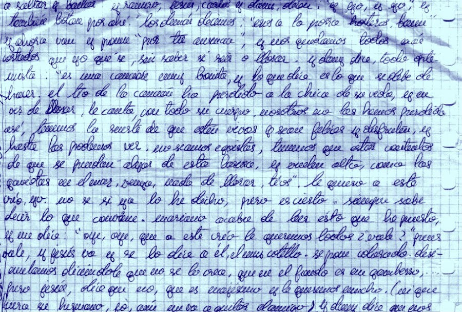 y ahora van y ponen en la radio “Por tu ausencia”, y nos quedamos todos más cortados que yo que sé, sin saber si reír o llorar. Y Miguel dice, todo optimista: “Es una canción muy bonita y lo que dice es lo que se debe de hacer. El tío de la canción ha perdido a la chica de su vida y en vez de llorar, le canta con todo su cuerpo. Nosotros no las hemos perdido así. Tenemos la suerte de que estén vivas y sean felices y disfruten, y hasta las podemos ver. No seamos egoístas, tenemos que estar contentos de que se puedan alejar de esta basura y vuelen alto, como las gaviotas en el mar. Venga, nada de llorar, tíos.” Le quiero a este crio, yo. No sé si ya lo he dicho, pero es cierto. Siempre sabe decir lo que conviene. Sebas acaba de leer esto que he puesto y me dice: “Oye, oye, que a este crio le queremos todos ¿vale?”, pues vale, y Carlos va y se lo dice a él, el muy cotillo. Se pone colorado. Acabamos diciéndole que no se lo crea, que en el fondo es un gamberro... pero Carlos dice que no, que es majísimo y le queremos mucho.