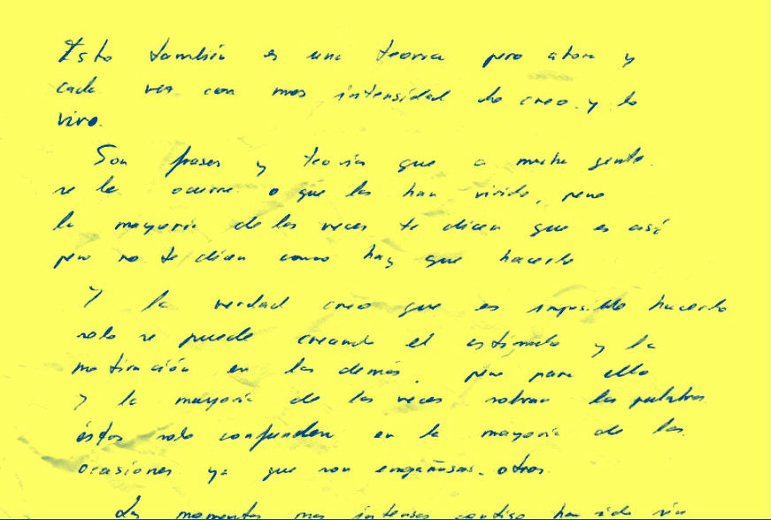 I guess also that everything that I see wrong in you even if repressed, but I´d have also wanted to live it before; therefore and, with the same intensity, I know that was also wrong in me, but now I want to transform it, and I hope everything is forgotten, and I need to value myself perhaps not totally in what I am, but in what I can be or in fact I am inside of me, and it costs me so much to discover; that is, I am going to start doing things that make me feel good even if its hard for me to leave this pen aside and also the cigarette, the radiator and the armchair.