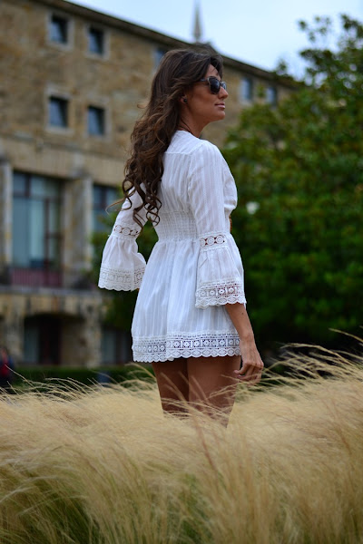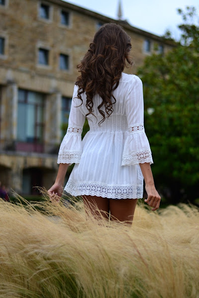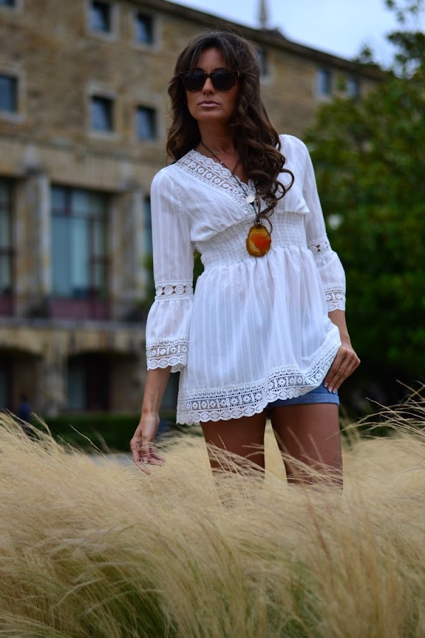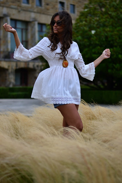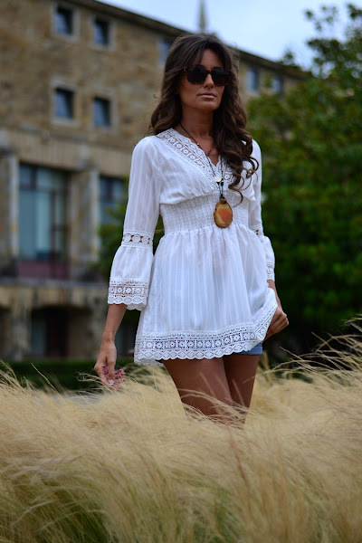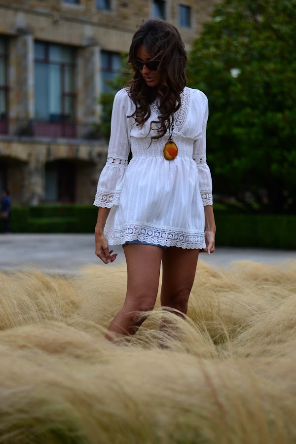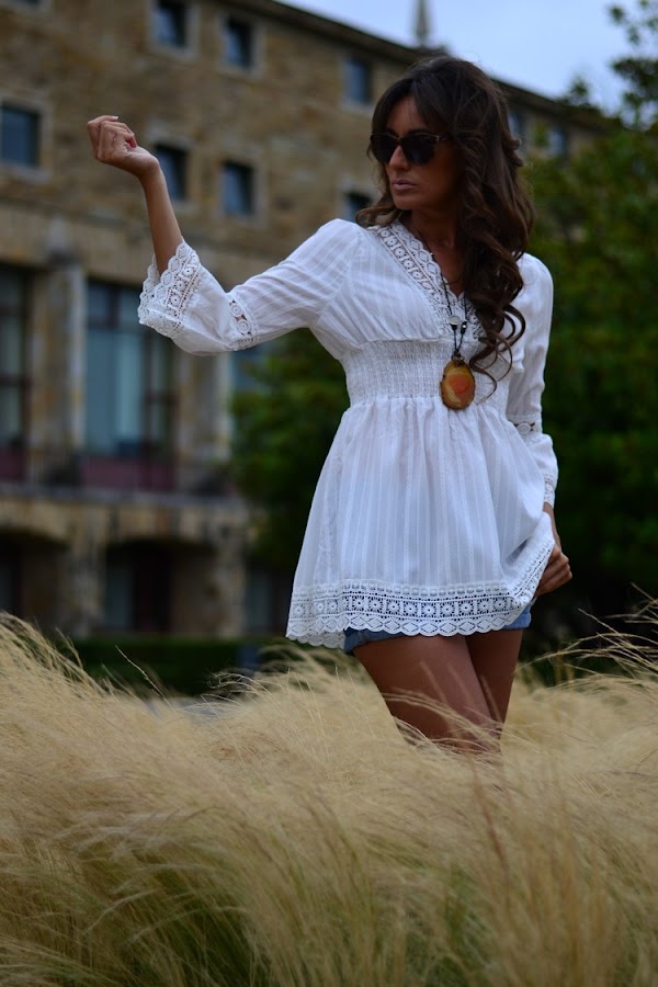 Hoy me gustaría enseñaros este vestidito blanco de encaje y cuello en V de Romwe que tanto me gusta y que, como podéis apreciar en las imágenes, he querido reinterpretar en versión blusón, metiéndole un short. (Tal vez en vacaciones, me atreva a llevarlo sin nada debajo...).