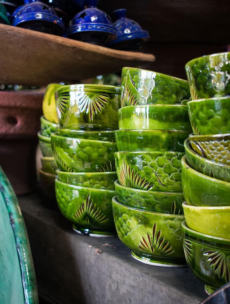 Vamos de regreso en caravana de 4×4 y ahora la ruta cambia. Mientras vamos dejando atrás las dunas, nos acercamos al valle del Draa, el río más largo de Marruecos, y en cuyos bordes las palmeras brotan como pasto después de la lluvia. Como en Marrakech, aquí las palmeras son sagradas y es ilegal talarlas. Junto con la vegetación y el agua, volvemos también a los asentamientos: una parada exprés en Tamegroute, el primer pueblo marroquí en hacer cerámica y que a la fecha sigue produciendo el mismo pigmento verde, inigualable en ningún otro lugar, que hace cientos de años.