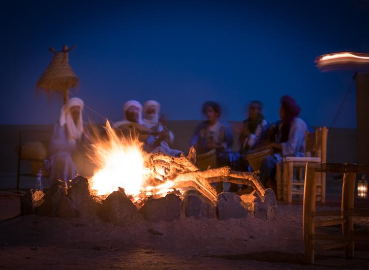 Desafortunadamente, el sol comienza meterse y no puedes quedarte a lo alto de una duna para siempre. Pero mashi mushkil, no hay problema. De regreso en el campamento, nos espera una gran fogata, un banquete marroquí, y una banda de músicos de Zagora, que nos acompañan tocando Gnawa, la música subsahariana de raíces africanas e islámicas. Entre el tambor, el laúd, y los cantos, parece ser una música espiritual casi de carácter ritual, así que hay que pararse a bailar al ritmo del desierto, con la luna llena de fondo y un centenar de velas rodeándonos. Es la noche en el desierto: mágica, misteriosa.