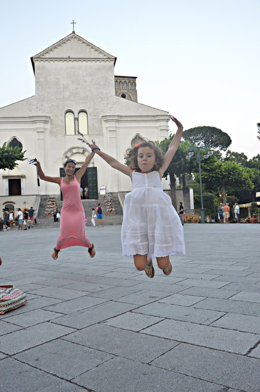 Ravello cuenta también en su plaza principal con una enorme iglesia, totalmente diferente a la de Amalfi, pero igual de bonita donde hicimos nuestro divertido jump y es que además habíamos cenado de lujo, lo que nos dio fuerzas para saltar muy alto.