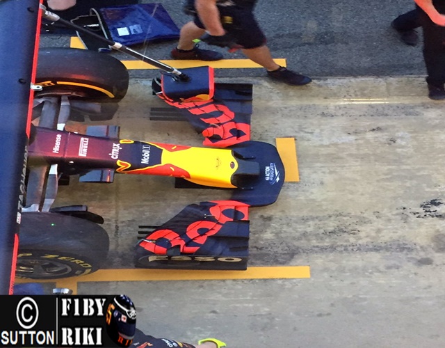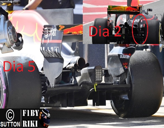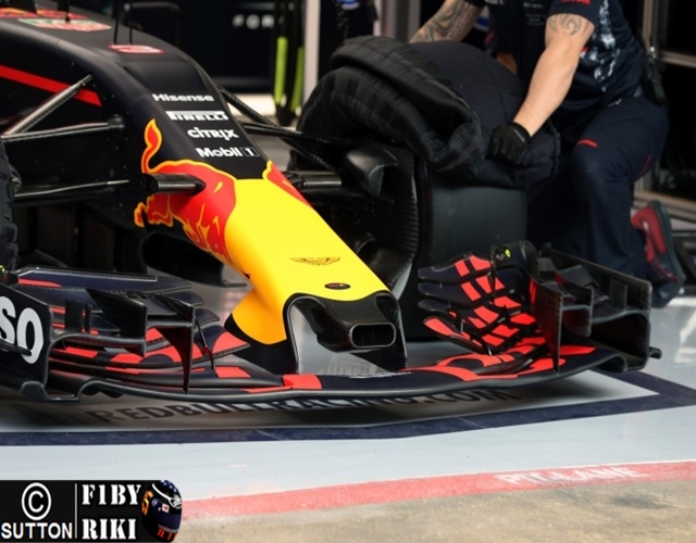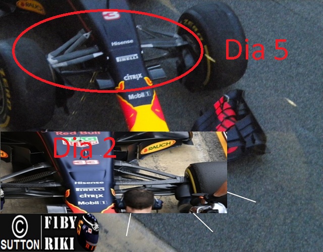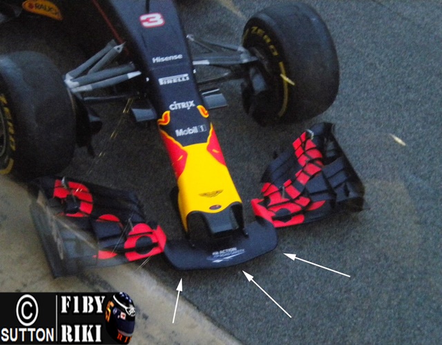 Como podemos apreciar en las imagenes, el diseño de los flaps de los alerones es básicamente el mismo, es decir, por ahora, Red Bull se ha mostrado continuista en el desarrollo de esta área del coche, a tal punto que mantienen el diseño visto en el GP de Abu Dhabi 2016, solo que adaptado a las dimensiones que el reglamento actual demanda.