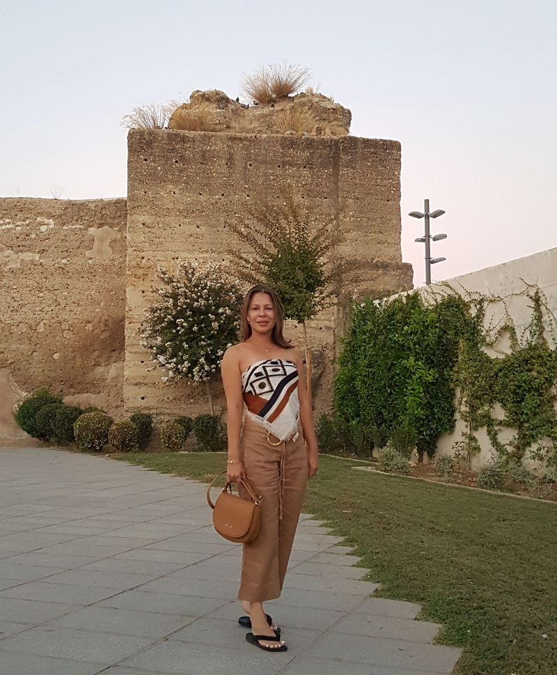 En el post anterior, que puedes ver aquí , mostré ya una parte del pueblo de Palma del río, y en el de hoy muestro una parte de sus murallas (ruinas de la época Árabe), que me recordaron mucho a mi querida Cartagena de Indias. Para este día elegí un look como dije anteriormente, sencillo e ideal porque el calor lo ameritaba; solo tomé un chal y lo convertí en top, anundado atrás, lo combiné con un pantalón cullote, un bolso del mismo color del pantalón y unas flip flop negras, para poder caminar todo el pueblo.