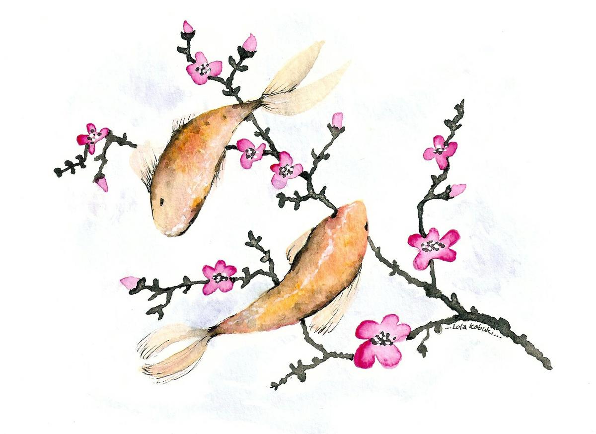 Carpas anaranjadas en el agua con una rama de flores rosas. La composición recuerda a un estanque japonés. El fondo es blanco con unas pinceladas de color azul muy claro. Este tipo de peces, suelen aparecer frecuentemente en mis pinturas, y a veces vuelan en vez de nadar: Peces voladores .