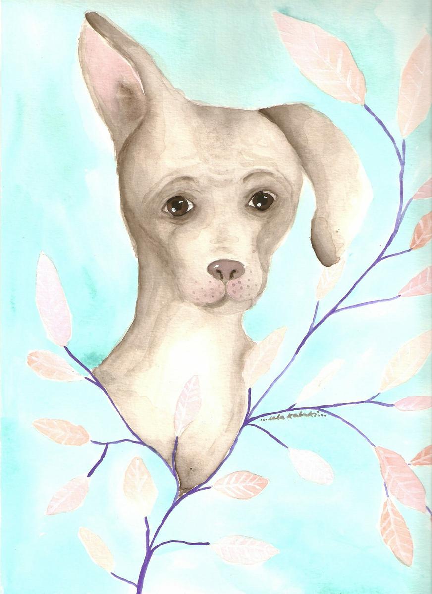 Este cachorrito es un mestizo de galgo. He usado una paleta de colores suaves en tonos pastel y le he dado prioridad a la expresión sobre la forma. Realizado en acuarela y tinta. Me encanta pintar mascotas!