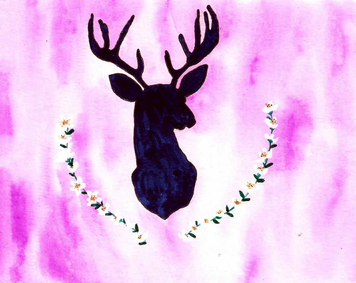 Silueta de cabeza de ciervo en color marino sobre fondo marmoleado en color violeta. Pintado con acuarela y tinta blanca.