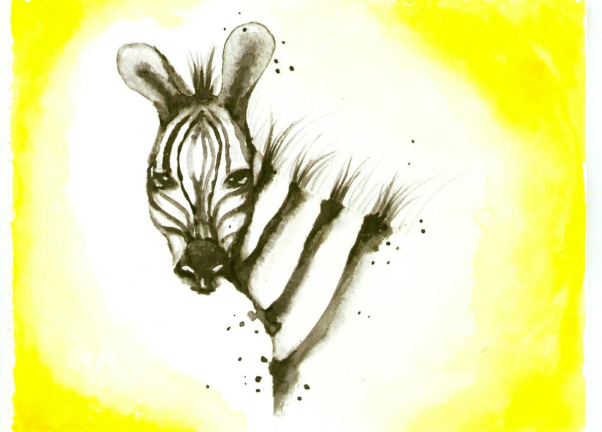 Cebra en blanco y negro con fondo amarillo limón a contraste. Esta pintura es una copia de otra que vi en Pinterest.