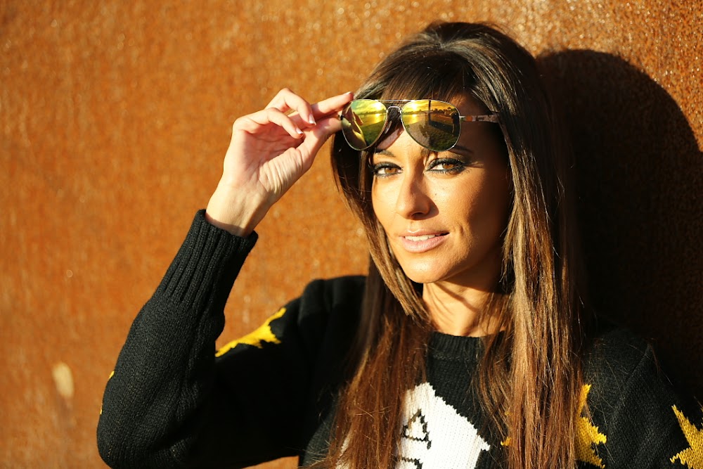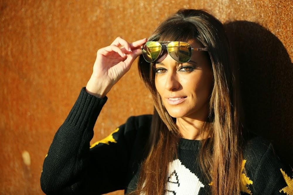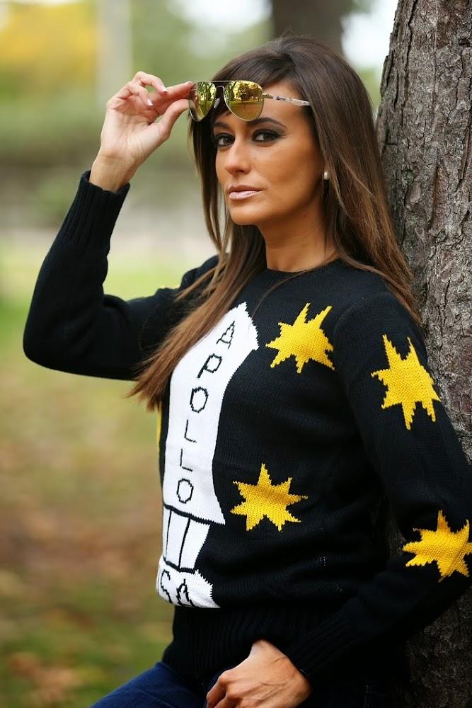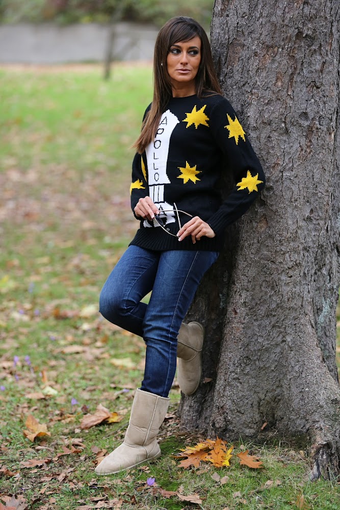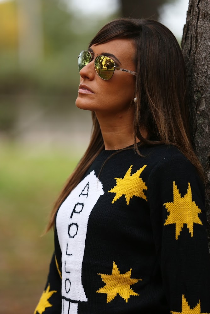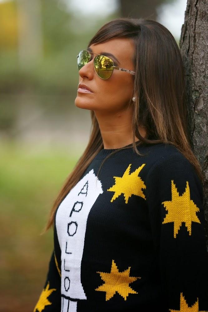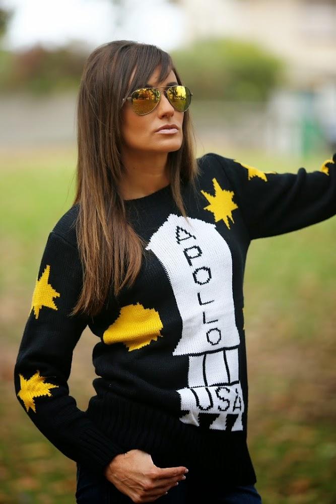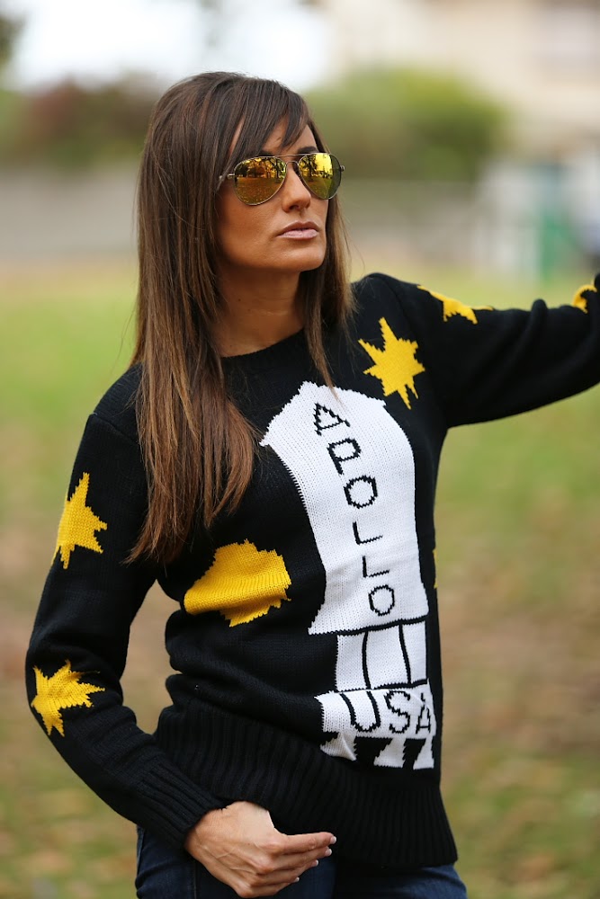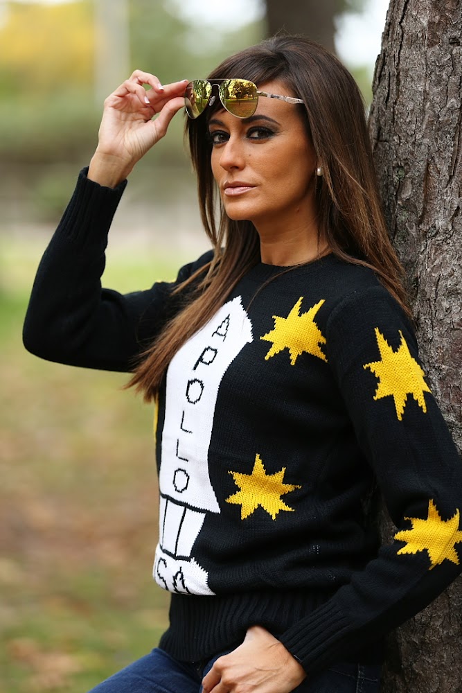 Aprovechando los últimos rayos del sol otoñal (ya sabéis que soy como las largartijas... jijiji), que aparecieron tímidamente casi casi al atardecer, estrené, como veis, mis nuevas Naverick de aviador con cristales dorados, a juego con el color de las estrellas del jersey.