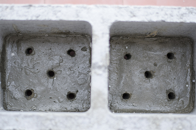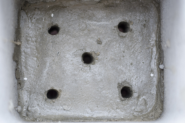 Cuando el cemento fraguó, toman la varilla (o cualquier elemento circular que tenga aprox. 1 cm de diámetro) y lo hunden en el material, hasta el fondo, para marcar los orificios de drenaje.