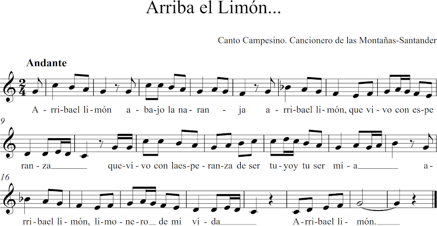 Arriba el Limón. Partitura para flauta dulce. Canción tradicional de las Montañas-Santander. La podemos trabajar a partir de 6º dependiendo del nivel del alumnado.