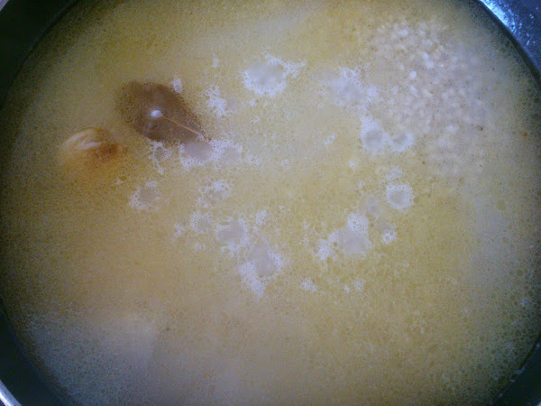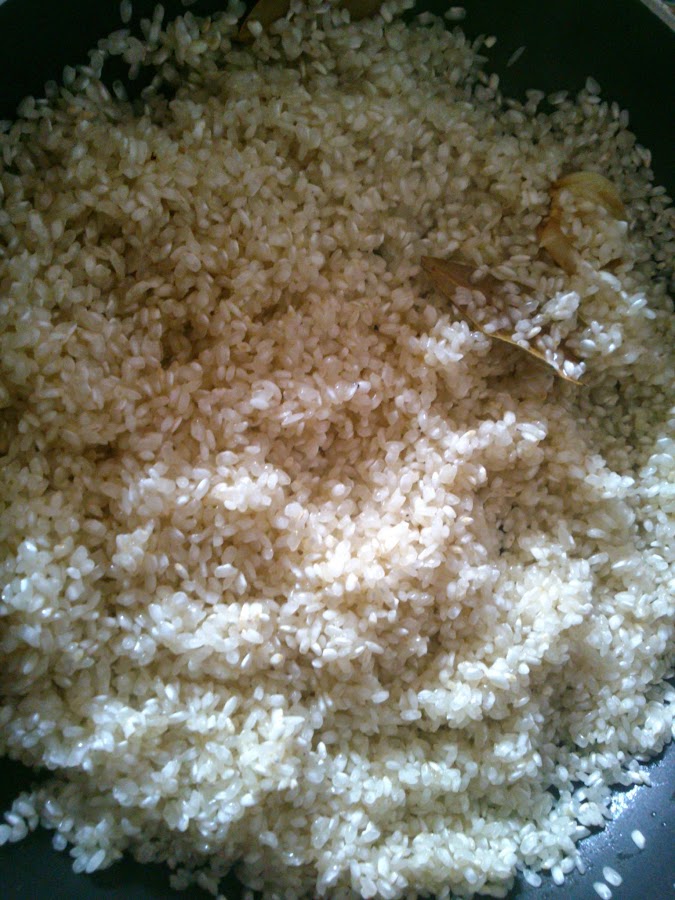 En primer lugar ponemos una sarten grande al fuego, calentamos el aceite de oliva y añadimos los dientes de ajo junto a las hojas de laurel, una vez los ajos estén dorados añadimos el arroz y lo sofreímos un poco, hasta que los granos empiecen a "transparentar", entonces es cuando añadimos el agua (el doble de agua que de arroz) y lo dejamos hervir hasta que se cueza.