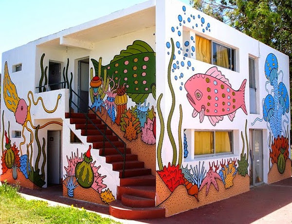 La obra de Alfalfa es lúdica y colorida, una de sus características es la de incorporar figuras marinas en sus composiciones.