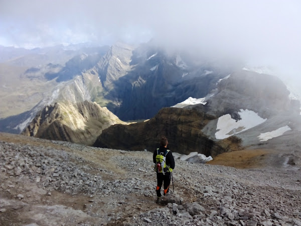 Lo poco que queda del Glaciar Ossoue y su rápido retroceso en estos últimos años es algo muy evidente. Aún así, hay que utilizar material de invierno en la subida hacia el Vignemale y tener cuidado con alguna que otra grieta. En septiembre no tiene ningún peligro, de no ser que se meta la niebla como nos pasó a nosotros, en cuyo caso, el GPS es de gran ayuda.