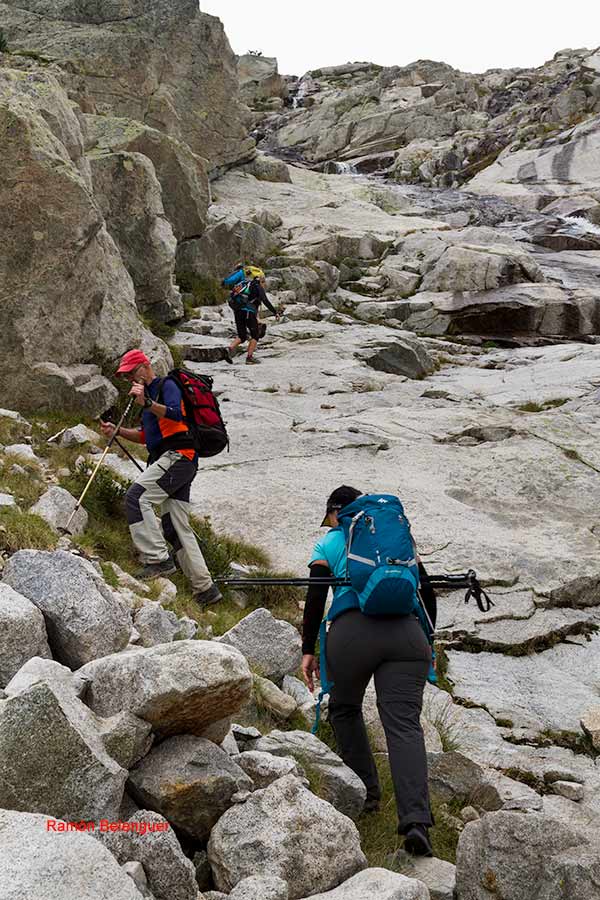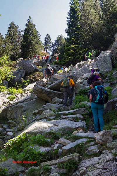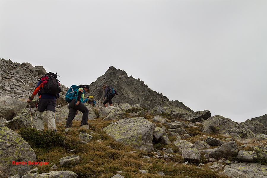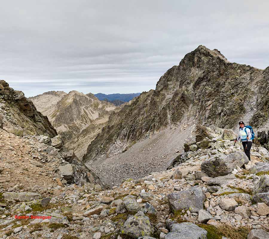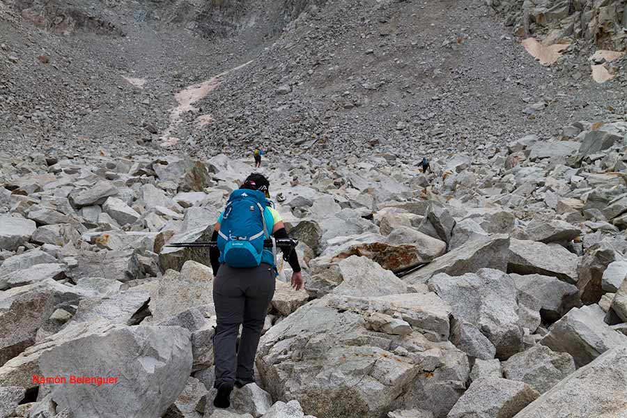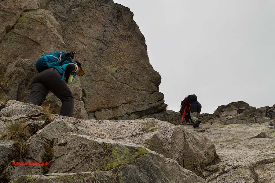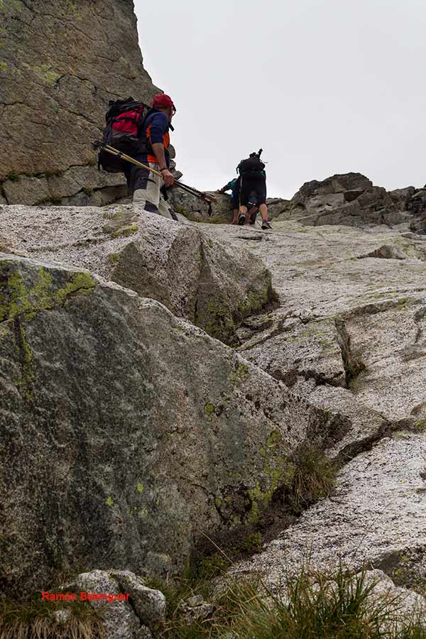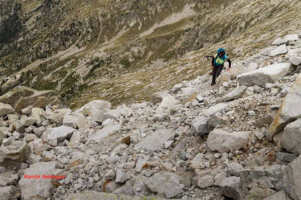empieza en el refugio de Conangle y al principio discurre por un hermoso bosque misto de abetos y hayas por el Valle de Besiberri, Estany de Besiberri, Refugio de Besiberri, Estanyety Coll de Abellers. En total son unos 1600 metros de desnivel acumulado. El paso más peligroso es la pedrera para acceder al collado d´Abellers (2885 mts) que separa el Besiberri sur del Abellers, se trata de una pedrera con un fuerte desnivel y mucha piedra pequeña suelta que produce fácilmente la caída de piedras, con lo que hay que estar muy atentos y no ir muy próximos ni en la misma perpendicular que el compañero, considero que habría que llevar casco. Una vez en el collado, a la derecha queda pico d´Abellersy a la izquierda nuestro objetivo. Para volver a la pedrera para bajar hay que fijarse bien y total la canal que sale desde el poste indicativo de Parque Nacional, pues si cogemos la que sale más a la derecha, cosa que hicimos, es mucho más peligrosa que por la que subimos. Personalmente recomiendo hacerla cuando este nevado, nos evitamos la pedrera de aproximación al pico que tan pesada la ruta.