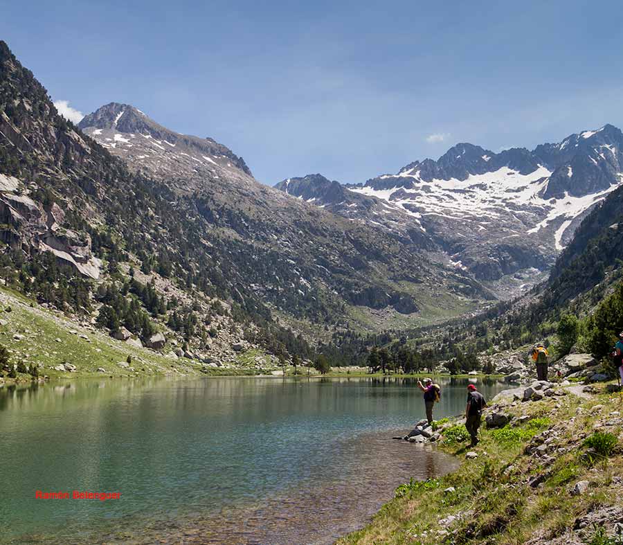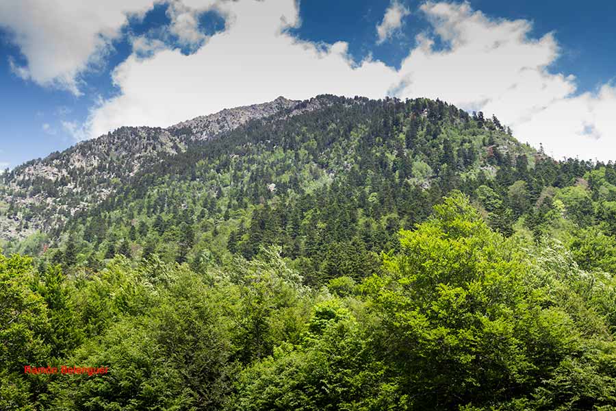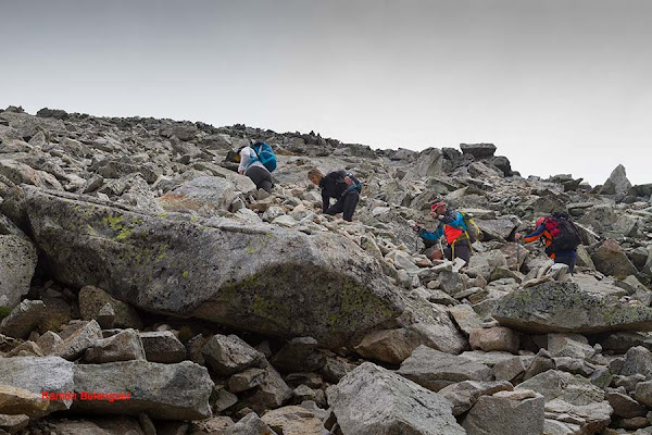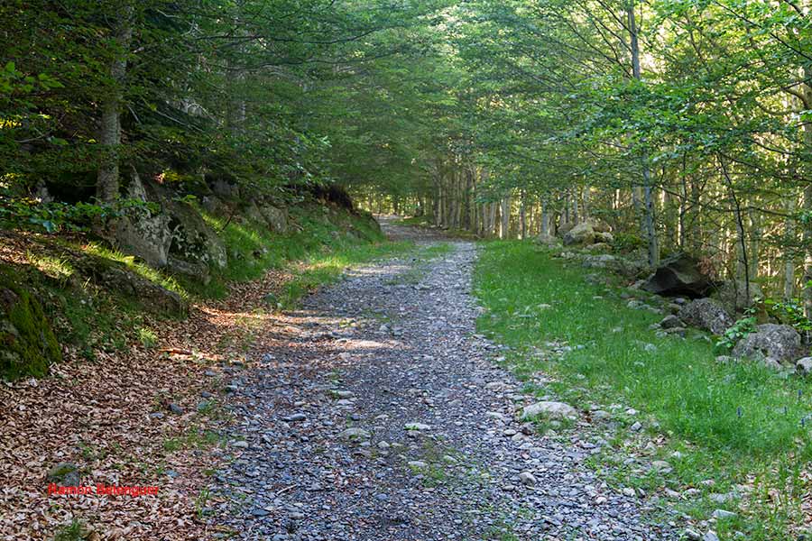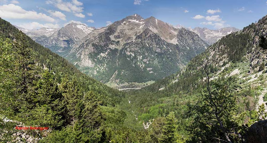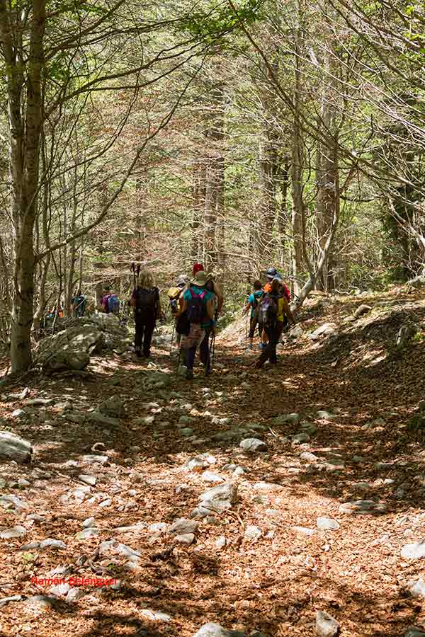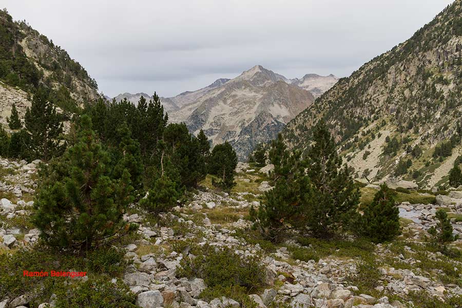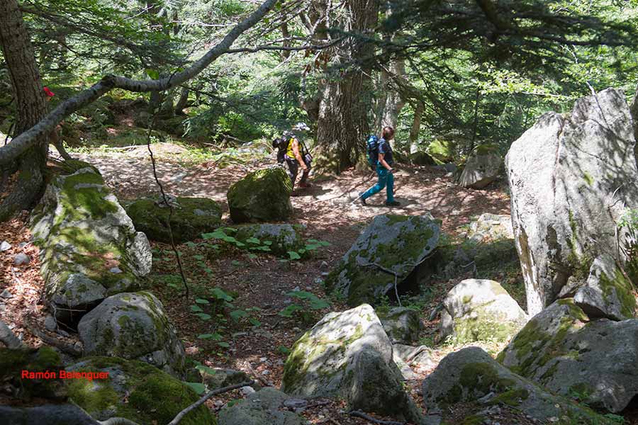 empieza en el refugio de Conangle y al principio discurre por un hermoso bosque misto de abetos y hayas por el Valle de Besiberri, Estany de Besiberri, Refugio de Besiberri, Estanyety Coll de Abellers. En total son unos 1600 metros de desnivel acumulado. El paso más peligroso es la pedrera para acceder al collado d´Abellers (2885 mts) que separa el Besiberri sur del Abellers, se trata de una pedrera con un fuerte desnivel y mucha piedra pequeña suelta que produce fácilmente la caída de piedras, con lo que hay que estar muy atentos y no ir muy próximos ni en la misma perpendicular que el compañero, considero que habría que llevar casco. Una vez en el collado, a la derecha queda pico d´Abellersy a la izquierda nuestro objetivo. Para volver a la pedrera para bajar hay que fijarse bien y total la canal que sale desde el poste indicativo de Parque Nacional, pues si cogemos la que sale más a la derecha, cosa que hicimos, es mucho más peligrosa que por la que subimos. Personalmente recomiendo hacerla cuando este nevado, nos evitamos la pedrera de aproximación al pico que tan pesada la ruta.