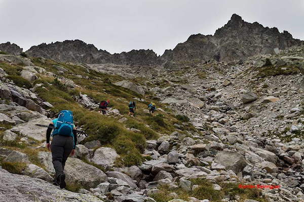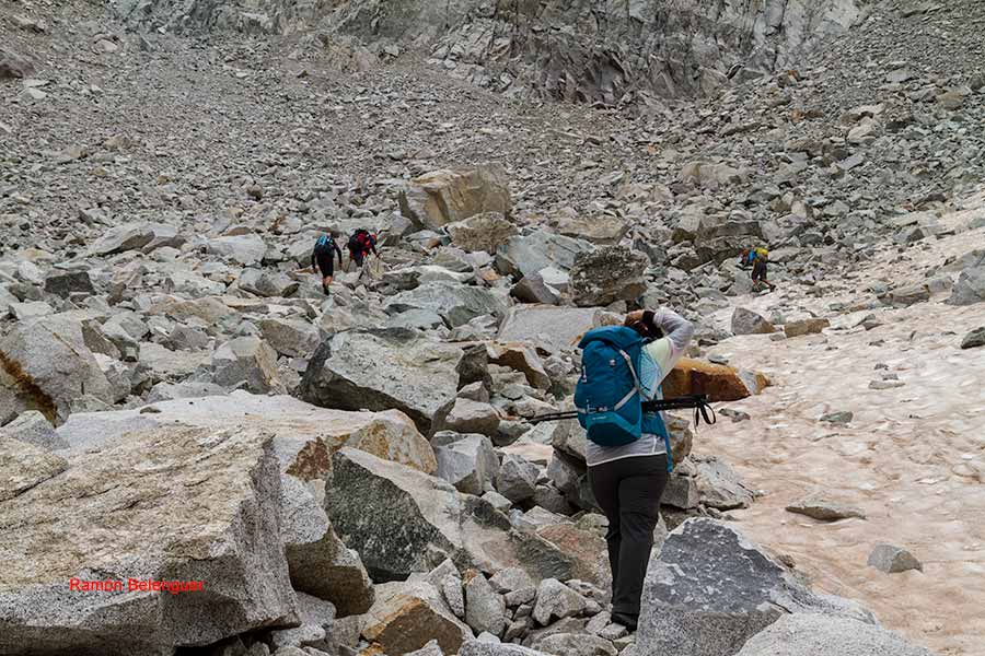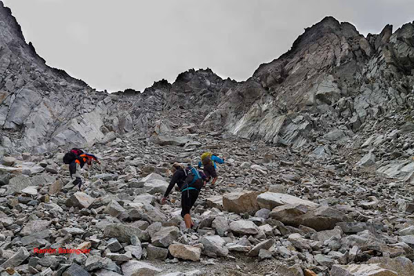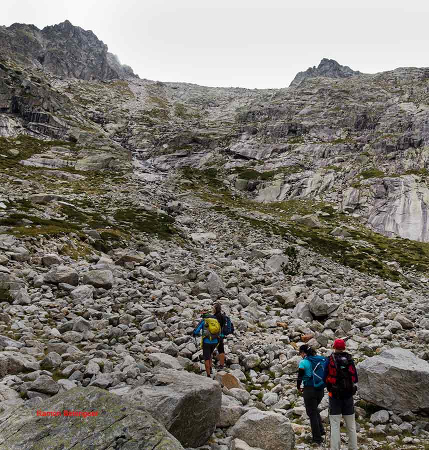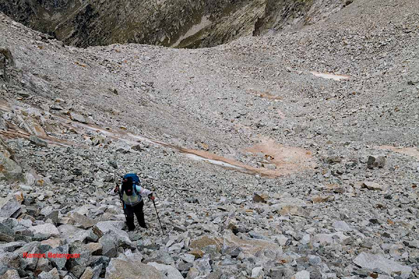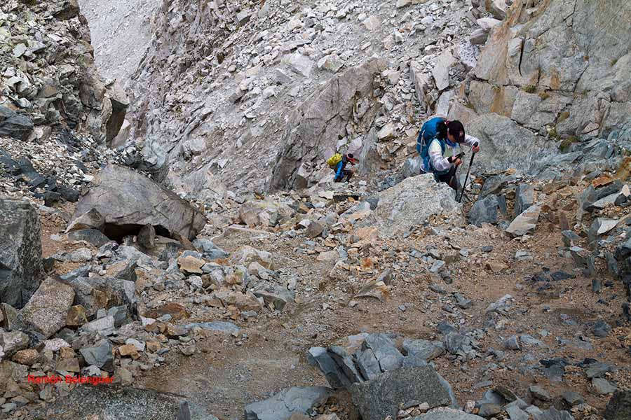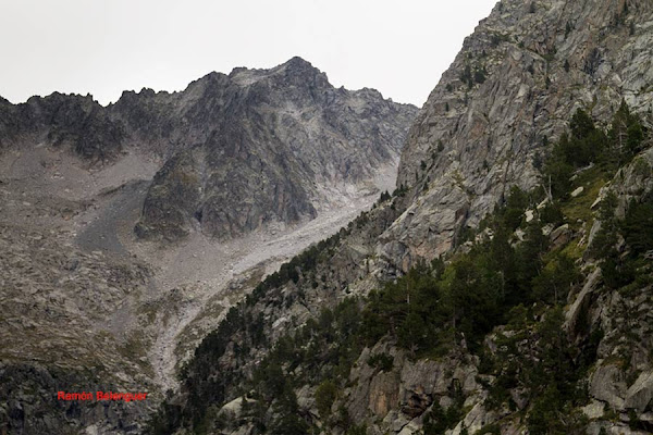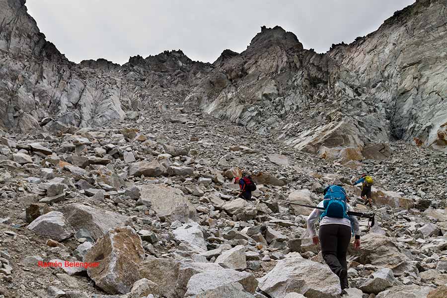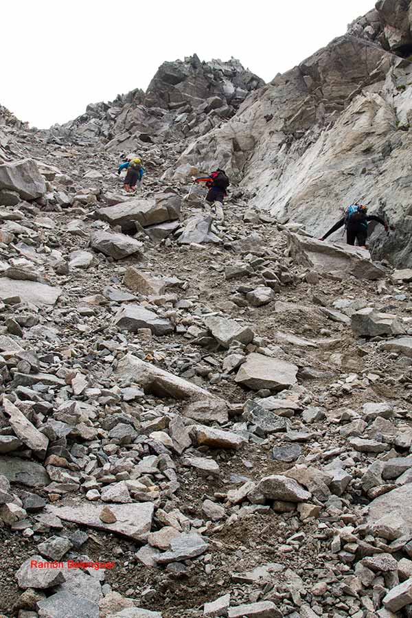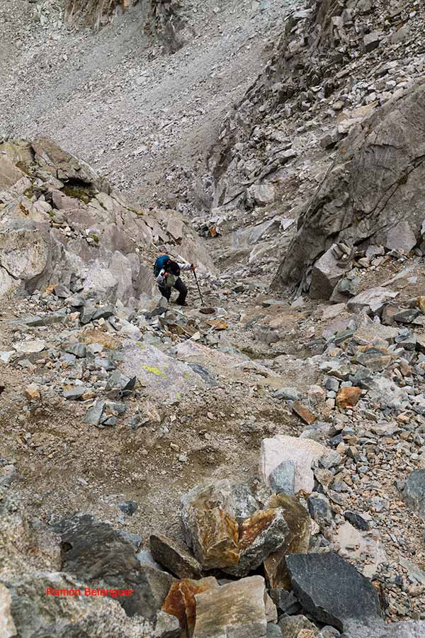Canal de acceso al collado d´Abellers, recomiendo el uso de casco, a la izquierda se puede ver la canal a evitar de bajada