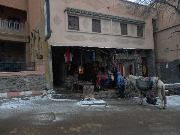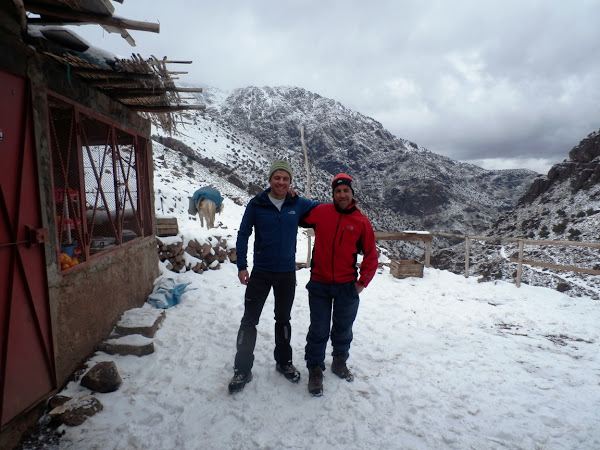 Después de la cumbre sólo nos quedaba descender los más de 2.500 metros que hay hasta la aldea de Sidi Chamarouch, donde Hassan nos tenía preparado un buen té y unas nueces de su propio cultivo. Pasamos la noche en un albergue de la misma aldea. Nuestra sorpresa llegó al día siguiente cuando al levantarnos por la mañana vimos que habían caído 20cm de nieve. Vimos que no podíamos perder el tiempo porque teníamos que andar hasta Imlil y coger un taxi a Marrakech. El avión salía a media tarde.