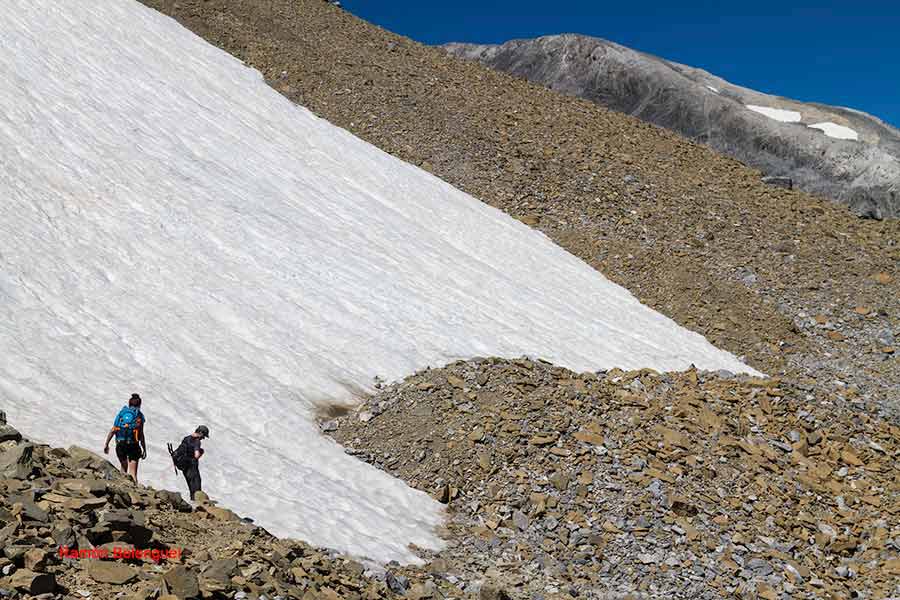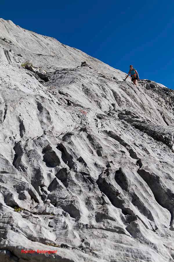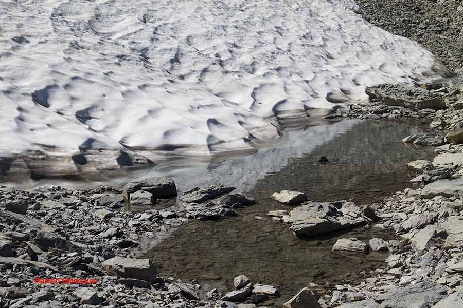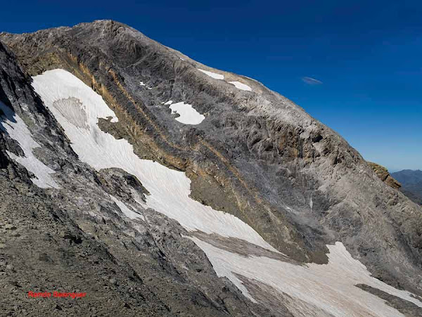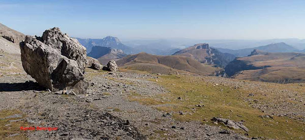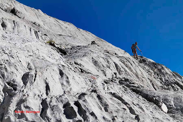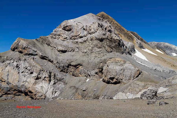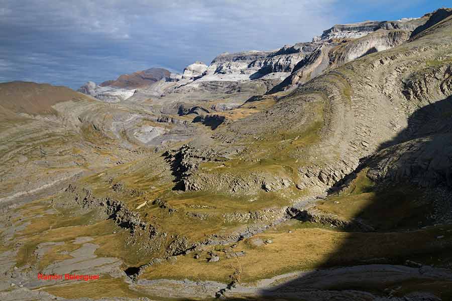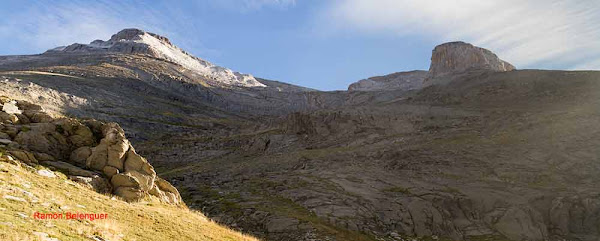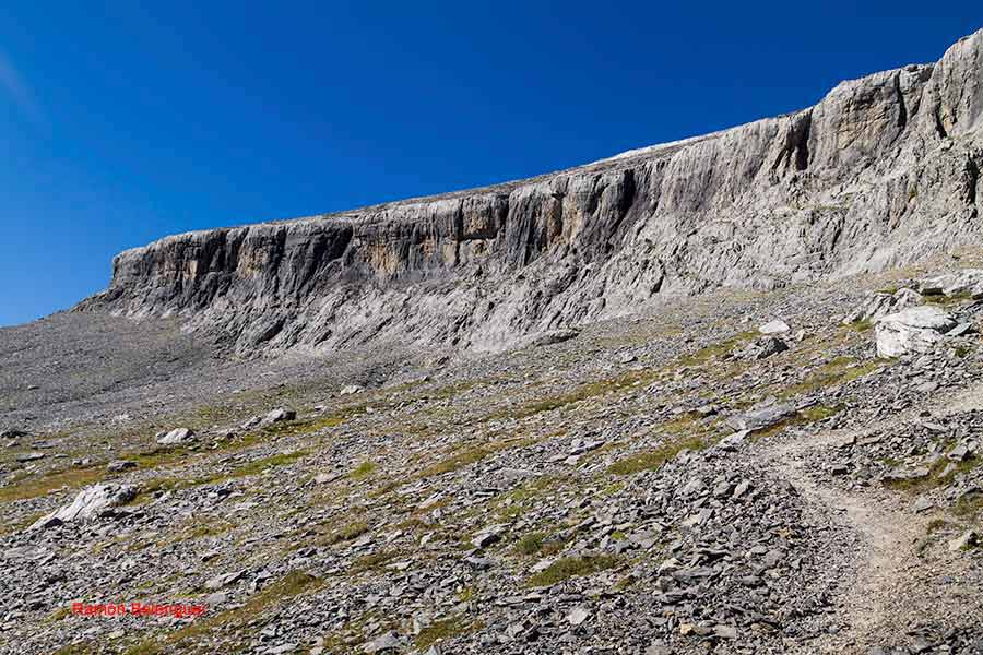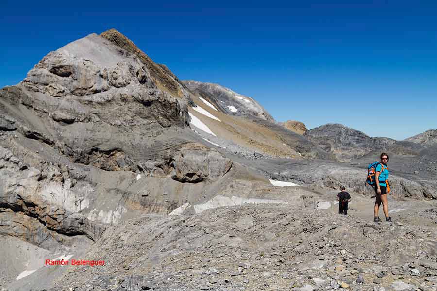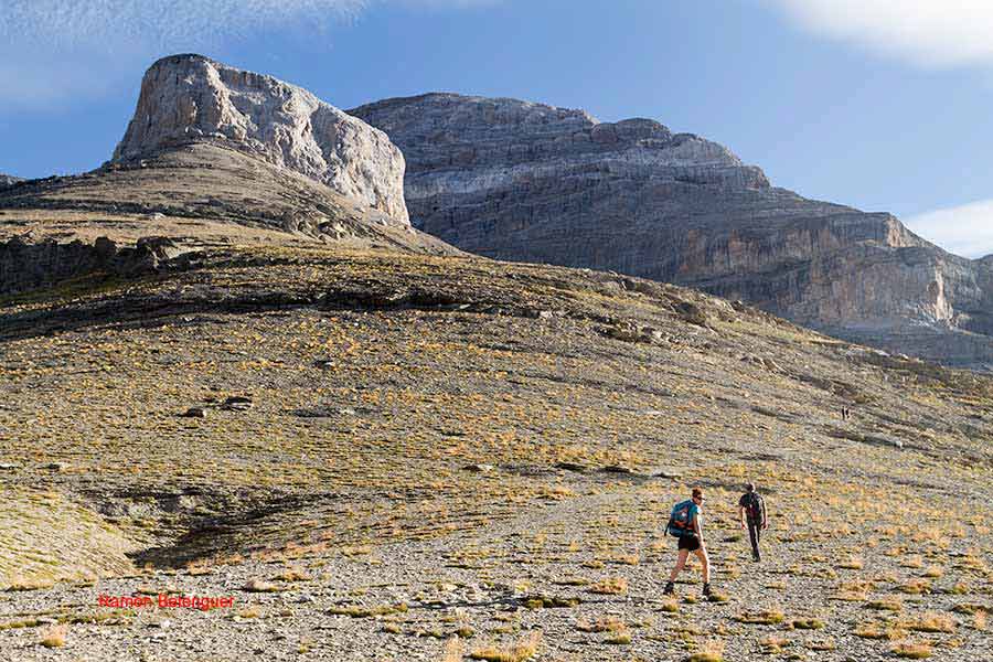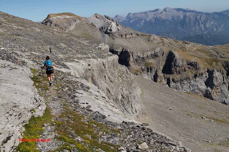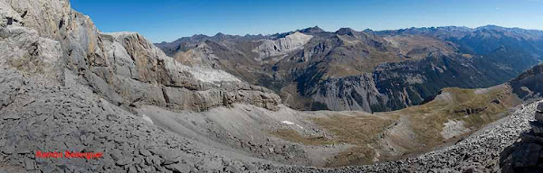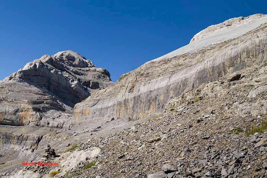 Salimos desde el refugio de Góriz en dirección sureste, siguiendo el GR 11 que une Góriz con Pineta, para subir al collado superior de Goriz o de Arrablo. Una vez aquí el GR 11 se divide en dos,un ramal baja en dirección a la Fuenblanca y otro se dirige hacia el collado de Anisclo, que será el que tomemos para ganando altura y pasando por debajo de las paredes verticales de la Punta de las Olas. Por nuestra derecha se ve el cañón de Añisclo. Más adelante, el sendero llega a un doble hito a modo de portería que es el desvío hacia la Punta de las Olas, momento en el que abandonamos el GR para iniciar su ascensión, trepando por un roquedo que nos llevara a una pedrera hasta los 3000m, tras otra breve trepada alcanzamos la Punta de las Olas (3022 metros), desde donde se ve el Añisclo.Desde Punta de las Olas se inicia un descenso de unos 50 metros de desnivel para alcanzar una zona plana entre los picos Soum de Ramond y Baudrimont SE, senda que nos conduce bordeando la pared de la montaña ala empinada pedrera de la cara este del Añisclo. Una vez llegados a la cresta en el track que llevábamos nos indicaba girar a la derecha para dirigirnos a Monte Perdido, pero como las vistas del camino a seguir no nos gustaban nada por la dificultad aparente, lo que nos confirmaron posteriormente una pareja de montañeros vascos, decidimos bajar de nuevo por la pedrera, para seguir recto hasta llegar ala base del glacial del Monte Perdido, como no llevábamos crampones decidimos dar media vuelta y deshacer el camino, para volver por las Olas al refugio de Goriz.