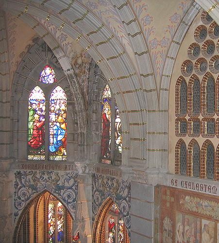 La cubierta de la construcción toma la forma de cruz griega a dos aguas con piezas de pizarra. Son notables los “arcos de huevo” del pórtico, los huecos abiertos en arcos en forma de hilos y los calados de la barandilla del pórtico y del remate de todo el edificio a su alrededor copiados del repertorio ornamental de Viollet le Duc. El arquitecto Guereta que se hace cargo posteriormente de las obras se ajusta a los planos iniciales. El granito blanco y la pizarra de la cubierta resaltan en el exterior sobre la rosácea piedra de la Catedral.